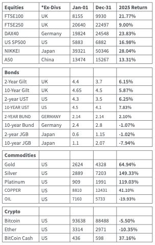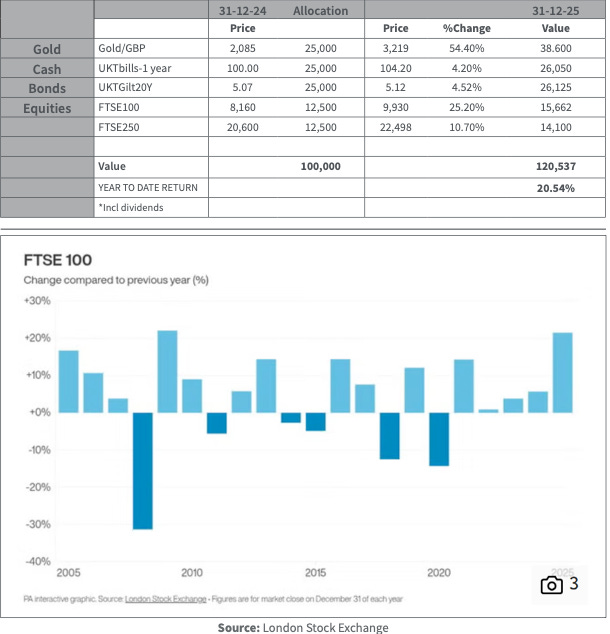 It’s that time of year where it’s good to take stock and look at what worked in the investment world and what didn’t. In general, 2025 was a storming year for anyone who had precious metals as a good part of their portfolio. Whether it was the physical metal itself or the relate mining equities, it was truly a sweet spot for returns. The Permanent Portfolio, (PP) that we publish every month here to keep investors focussed on having reasonably gold exposure has had its best year in a long while, +20.54% with gold up 65% being the main driver. The FTSE 100 had its best year since the post GFE 2009 stormer at +25% including dividends which is not to be sneezed at, despite the FTSE 250 lagging quite a bit, unsurprising given the state of the economic numbers in the UK. The FTSE 100 big winners were a split of miners, banks/insurers and defence stocks for the most part but even UK/US government bonds had reasonable returns as yields fell while paying out the coupon interest. Defence spending and geo-political worries driving precious metals while banks are benefitting from the steepening yield curves. (Borrow short-Lend Long =Profits etc).