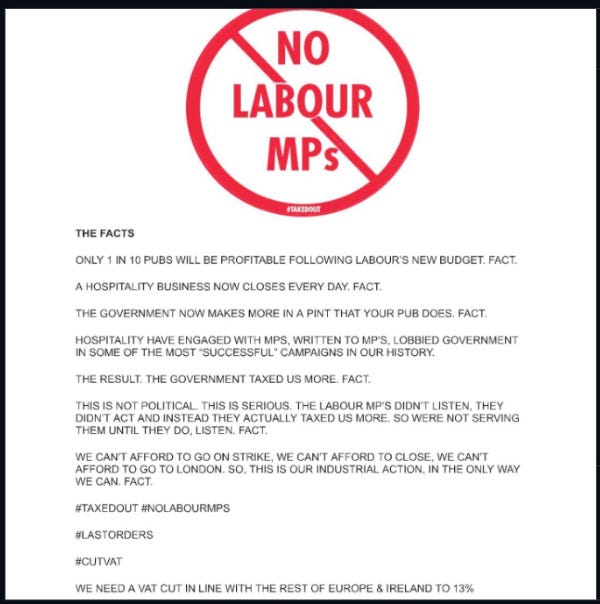 It doesn’t matter where you look, the working population in the private sector is in open revolt against the government, the latest visual is the growing number of pubs, bars and restaurants that are displaying signs barring Labour MP’s from their premises due to the horrendous tax increases that the hospitality industry faces. Of course, with pubs closing at a rate of one per day across the UK, it won’t just be the Labour politicians who will be resigned to drinking at home soon.